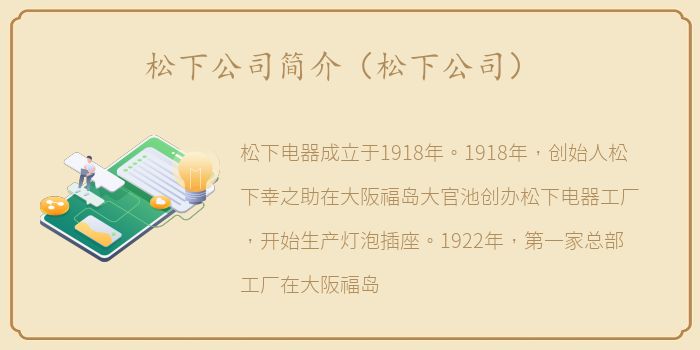 松下电器成立于1918年。1918年,创始人松下幸之助在大阪福岛大官池创办松下电器工厂,开始生产灯泡插座。