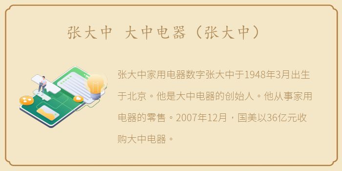 张大中于1948年3月出生于北京。他是大中电器的创始人。他从事家用电器的零售。2007年12月,国美以36亿元收购大中电器。之后,张大中退休了。2011年3月,国美电器董事长陈晓离任后,张大中出任国美电器董事长兼非执行董事的董事会。张大中,哲学专业,北京大中电器有限公司创始人;1984年,电子元器件的贸易挖到了第一桶金;1993年,张大中创办大众音响城,开始进军家电零售领域,并于1998年突破年销售额1亿元大关。1999年,大中电器正式成立,2004年实现销售额80亿元,占据北京50%的市场份额美国家电零售市场。1982年4月,张大中注册张集电器加工店这是当时唯一允许私企注册的名字。工厂就是自己的家,餐桌就是工作台。请一些熟人帮忙.'张继主要从事制造音频放大器。1988年9月,其营业额首次突破10万元。到1988年12月。张继占据了音频功放90%以上的市场份额。多重角色:操作员、销售人员、业务经理和技术人员。七、八道工序有条不紊的进行,从照相制版、腐蚀钻孔、焊接组装、测试调试到封装密封。大中电器创始人张大中在实践中增强了成本、利润、价格意识,积累了生产、管理、服务经验。这个小作坊很成功。1989年初,大众音响公司营业面积只有10平方米,开在北京西单卖组件。这是大中电器的第一家店。1989年4月,大众音响公司在北京成立了第一个专业的音响工程部,提供音响工程设计咨询和安装服务。到1992年12月,大众音响公司拥有100名员工,年营业额超过1000万元。1999年,大中电器作为电器专卖连锁店正式起航;2000年,大中电器开了6家连锁店;2001年有12家门店,营业额9亿元,员工1200多人。在2002年蓝背心代表大中电器服务精神的,正式推出为您服务是我最大的努力成为大中电器的核心服务理念;到2002年12月,营业额达到30亿元。大中电器被评为重合同守信用单位连续10年。大中电器创始人张大中曾任CPPCC常委。2003年,大中电器的开店数量增加到32家,占北京市场份额的50 成为覆盖北京的电器连锁店之一市中心、社区和郊区县。同年,大中电器大中电器首家外地门店天津黄河路店开业,标志着大中电器离开北京,成为一家全国性的电器连锁销售商。2005年,大中电器加快全国连锁步伐,全国连锁门店近百家,居北京电器销售额之首,获得北京十大商业品牌2006年,大中电器将坚持北京更强大,全国更精致还有突破数字,实现3C 继续推动自身的深入发展,使大中电器从电器产品的提供者转变为电器消费的引导者,从产品(服务)的提供者转变为品牌(文化)的传播者,从规模取胜的全国连锁转变为引领行业的国际品牌。2011年3月9日,国美通过HKEx宣布,大中电器创始人中将张达接任国美电器董事长并担任非执行董事。他虽然是非执行董事,但最终能代表大股东和小股东的共同利益。它在未来的发展中起着重要的作用