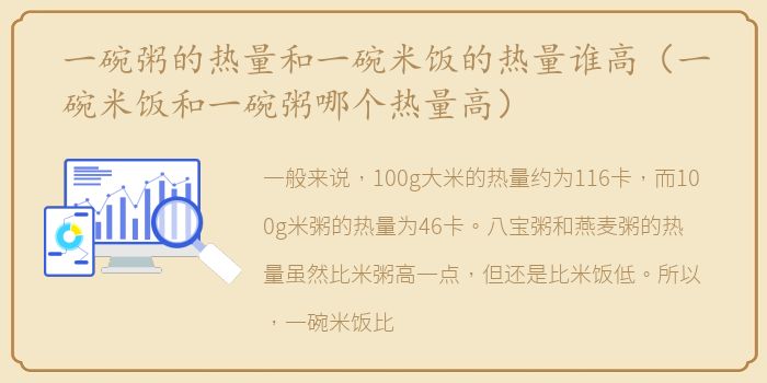 一般来说,100g大米的热量约为116卡,而100g米粥的热量为46卡。八宝粥和燕麦粥的热量虽然比米粥高一点,但还是比米饭低。