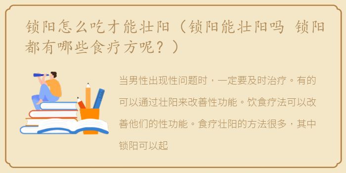 有很多针对男性的药物壮阳,那么锁阳能壮阳吗?锁阳有壮阳作用。锁阳的吃法很多,可以壮阳。