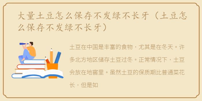 “五忌”如下避免暴晒:储藏前,把坏的烂土豆扔掉,然后把好的放在阴凉通风处干燥处。2、忌潮湿:尽量放在房子角落的沙子里,保证干燥。