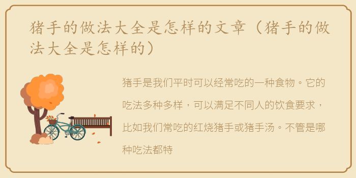 以上是猪手的做法介绍。了解之后,我们就可以根据自己平时的需求和口味来制作食物,从而更好的增加食欲。