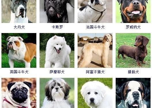 2、大丹犬、卡斯特罗、法国牛头犬、罗威纳、英国牛头犬、萨摩耶、阿富汗猎犬、腊肠犬、哈巴狗、西施犬、大白熊、圣伯纳德等