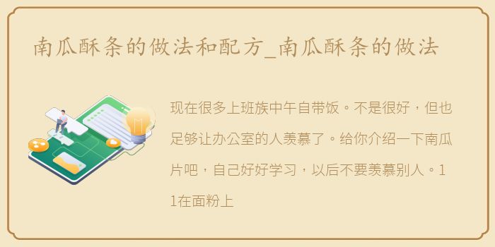 给你介绍一下南瓜片吧,自己好好学习,以后不要羡慕别人。1.1在面粉上均匀的涂上一层面粉;2.2将南瓜切成条状;3.再蘸蛋清;4.均匀地涂上面包屑;5.炒菜时锅内放入比平时多3-4倍的油,0.10-310.158分钟加热;放入裹有面包屑的南瓜;6.煎至金黄色;拿出来;放油;摆盘;你可以开始做你想做的南瓜脆片。