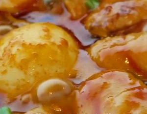 准备一个砂锅或者电饭锅热油,加入姜蒜片炒出香味,把洋葱加进来,腌好的配菜也加进来再。加几个煮熟的鸡蛋,用筷子铺匀,然后把腌好的鸡翅也加进来,盖上盖子,用小火焖20分钟,再来调一个酱汁,一勺番茄酱,一勺韩式辣酱,一勺蜂蜜,一勺蚝油,一勺生抽。