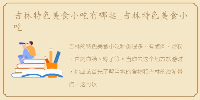 吉林的特色美食小吃种类很多,有卤肉、炒粉、白肉血肠、粽子等。当你去这个地方旅游时,你应该首先了解当地的食物和吉林的旅游景点,这可以让你的旅行更愉快。