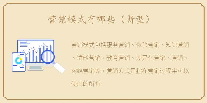 营销模式包括服务营销、体验营销、知识营销、情感营销、教育营销、差异化营销、直销、网络营销等。营销方式是指在营销过程中可以使用的所有方法。要有好的营销模式,首先要创造有效的营销工具。