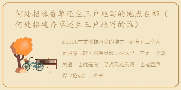"在灵魂被召唤的地方,药草有三个家是屈原写的。召唤灵魂:在这里,它是一个双关语,也就是说,寻找英雄灵魂,也指屈原工程《招魂》。香草:它代表写作技巧,这里指的是屈原或具有他这种性格和才华的人。三虎地:指楚国,《史记项羽本纪》云:楚虽三户,秦亡必引楚。"
