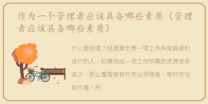 什么是经理?经理是负责一项工作并使其顺利进行的人。如果完成一项工作所需的资源或多或少,那么管理者有时充当领导者,有时充当执行者。所以,一个合格的、称职的、优秀的管理者,一定要有很强的领导力和很强的执行力。一个管理者至少应该具备以下素质: