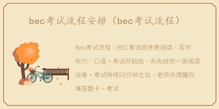 Bec考试流程:BEC考试顺序是阅读、写作、听力、口语。考试开始后,会先给你一张阅读试卷。考试持续50分钟左右,老师会提醒你填答题卡。考试大概一个小时的时候,老师会收阅读纸和答题卡,同时给你写卷子,写45分钟。