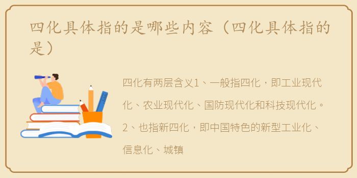 四化有两层含义1、一般指四化,即工业现代化、农业现代化、国防现代化和科技现代化。2、也指新四化,即中国特色的新型工业化、信息化、城镇化和农业现代化。