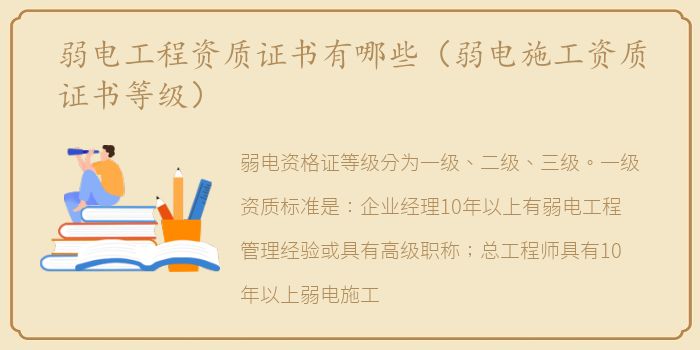 弱电资格证等级分为一级、二级、三级。一级资质标准是:企业经理10年以上有弱电工程管理经验或具有高级职称;总工程师具有10年以上弱电施工管理工作经验,并具有相关专业高级职称;总会计师具有中级以上会计职称。