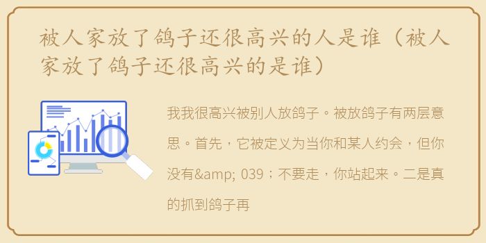 我我很高兴被别人放鸽子。被放鸽子有两层意思。首先,它被定义为当你和某人约会,但你没有&# 039;不要走,你站起来。二是真的抓到鸽子再放飞,这才是真正的放飞鸽子。在这里张贴一只鸽子不会不是说定了约会却没有守约,而是实际上贴了一只鸽子,所以它被放飞的鸽子是快乐的。因为它免费的,它快乐的是那只鸽子。