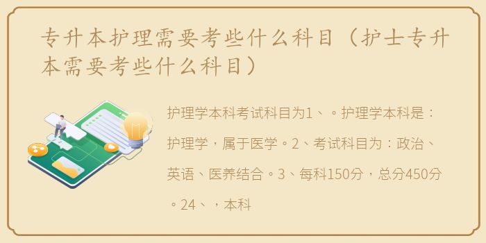 护理学本科考试科目为1、。护理学本科是:护理学,属于医学。2、考试科目为:政治、英语、医养结合。3、每科150分,总分450分。24、,本科的体检分数比较高,达到320-350左右,相对来说比较难考。5、公共课复习题中国尤氏大学的真题最好。它专业课最好买本科练习。