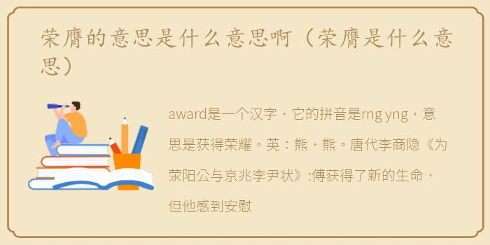 award是一个汉字,它的拼音是rng yng,意思是获得荣耀。英:熊,熊。唐代李商隐《为荥阳公与京兆李尹状》:傅获得了新的生命,但他感到安慰。"来源:唐李商隐《为荥阳公与京兆李尹状》:傅获得了新的生命,感到安慰。"袁树勋 《李谪仙》诗:召至金殿,得白玉堂。"