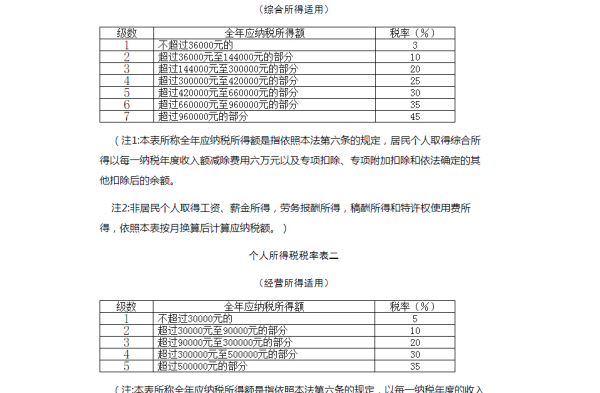 1。本表所列含税和不含税等级为按照税法规定扣除相关费用后的所得;2。含税级距适用于纳税人支付的工资、薪金所得;不含税等级适用于他人(单位)支付的工资、薪金收入。2、个体工商户、表21、工资薪金所得适用税率表1(工资薪金所得适用)系列月应纳税所得额税率(%)速算扣除含税、步距不含税、步距不超过1500元、步距不超过1455元、3 0 2、超过1500元至4500元部分、超过1455元至4155元部分、超过4500元部分超过7755至27255元的部分25 1005 5超过35000至55000元的部分30 2755 6超过55000至80000元的部分41255至57505元的部分7超过80000元的部分57505元注:本表所列含税和不含税档次为根据税法规定扣除相关费用后的收入;2。含税级距适用于纳税人支付的工资、薪金所得;不含税等级适用于他人(单位)支付的工资、薪金收入。2、个体工商户、表2企业税率等。表2税率(个体工商户生产经营所得和企事业单位承包承租经营所得)系列年应纳税所得额税率(%)速算扣除、含税步距、免税步距、不超过15000元、不超过14250元、5 0 2、超过15000元至30000元部分、超过14250元至27750元部分、超过30000元至60000元部分10万元以下,51750元以上至79750元,309750 5,10万元以上,79750元以上,3514750注:1。本表所列含税和不含税等级,是按照税法规定,从每个纳税年度的收入总额中减除成本、费用和损失后的所得;2。含税级距适用于个体工商户的生产经营所得和纳税人负担税款的企事业单位的承包经营、承租经营所得;不含税级差适用于由他人(单位)纳税的企事业单位的承包经营和承租经营所得。