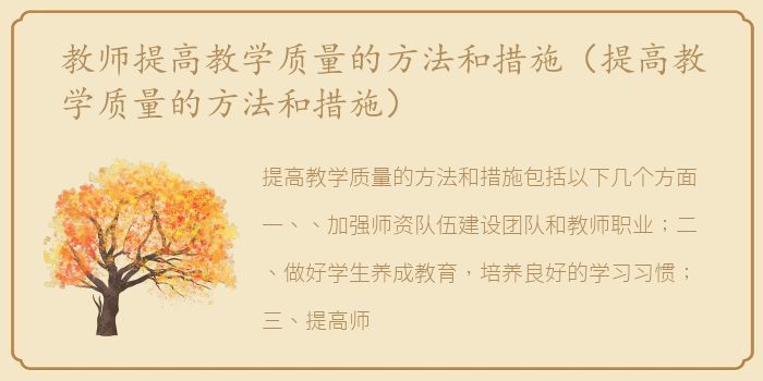 提高教学质量的方法和措施包括以下几个方面一、、加强师资队伍建设团队和教师职业;二、做好学生养成教育,培养良好的学习习惯;三、提高师资专业能力和狠抓教育教学管理;四、加强课堂过程管理;五、完善学校管理制度,形成良好的育人氛围;六、完善后勤保障管理系统。