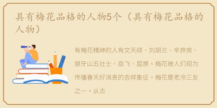 有梅花精神的人有文天祥、刘胡兰、辛弃疾、狼牙山五壮士、岳飞、屈原。梅花被人们视为传播春天好消息的吉祥象征。梅花是老冷三友之一。从古至今,人们都在赞美她傲雪的精神,赞美她不与花争春的孤独高洁的美。因此,她象征着一个高尚而坚强的人。梅花是中华民族的精神象征,具有强大而普遍的吸引力和推动力。