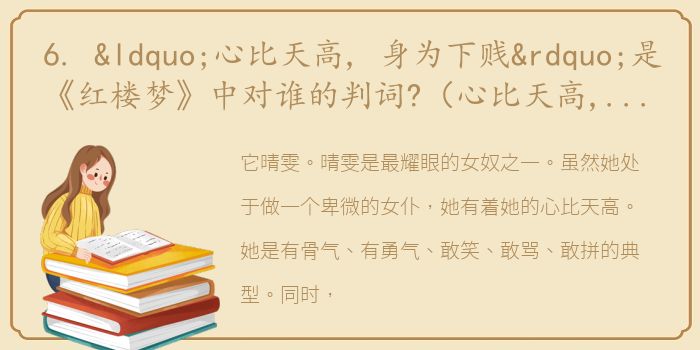它晴雯。晴雯是最耀眼的女奴之一。虽然她处于做一个卑微的女仆,她有着她的心比天高。她是有骨气、有勇气、敢笑、敢骂、敢拼的典型。同时,她又是一个善良、纯洁、多愁善感、勇敢、心灵手巧的少女形象。面对强大的封建势力,她进行了最坚决的斗争。
