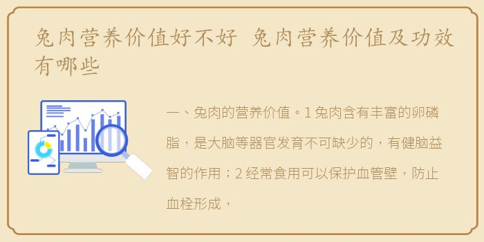一、兔肉的营养价值。1.兔肉含有丰富的卵磷脂,是大脑等器官发育不可缺少的,有健脑益智的作用;2.经常食用可以保护血管壁,防止血栓形成,对高血压、冠心病、糖尿病患者有益,还可以强身健体,强健肌肉。