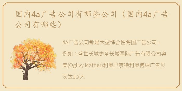 4A广告公司都是大型综合性跨国广告公司。例如:盛世长城史圣长城国际广告有限公司奥美(Ogilvy Mather)利奥巴奈特利奥博纳广告贝茨达比(大华)广告有限公司等