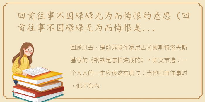 回顾过去,是前苏联作家尼古拉奥斯特洛夫斯基写的《钢铁是怎样炼成的》。原文节选:一个人人的一生应该这样度过:当他回首往事时,他不会为虚度年华而后悔,也不会为碌碌无为而羞愧。这样,当他快死的时候,他可以说,我的一生和我所有的经历都献给了世界上最壮丽的事业——,为人类的解放而战。"