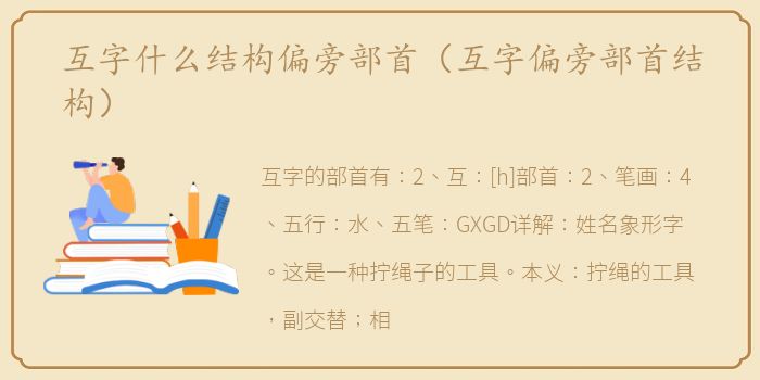 互字的部首有:2、互:[h]部首:2、笔画:4、五行:水、五笔:GXGD详解:姓名象形字。这是一种拧绳子的工具。本义:拧绳的工具,副交替;相互的、动态的移交。交换需要的物品,把自己多余的东西给对方,和对方交换得到自己缺少的东西。炫耀:互相夸耀,夸耀。互相夸奖吹牛。使用贬义。