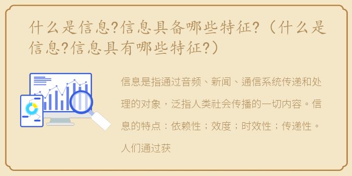 信息是指通过音频、新闻、通信系统传递和处理的对象,泛指人类社会传播的一切内容。信息的特点:依赖性;效度;时效性;传递性。人们通过获取和识别自然和社会的不同信息来区分不同的事物,从而认识和改造世界。