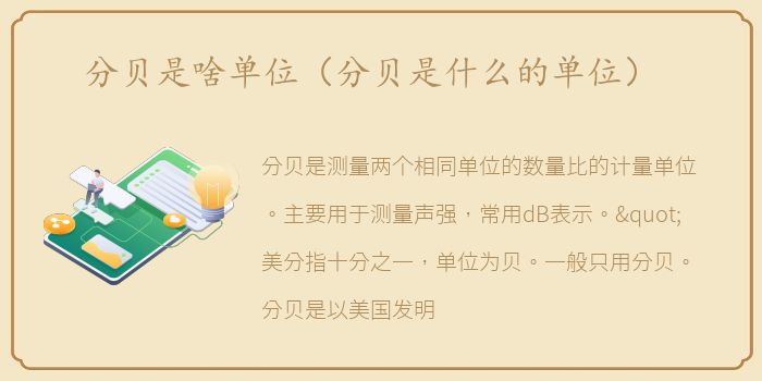 分贝是测量两个相同单位的数量比的计量单位。主要用于测量声强,常用dB表示。"美分指十分之一,单位为贝。一般只用分贝。分贝是以美国发明家亚历山大格雷厄姆贝尔命名的。