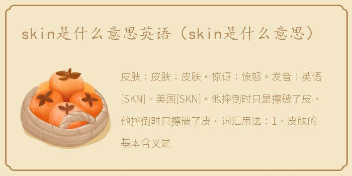 皮肤;皮肤;皮肤。惊讶;愤怒。发音:英语[SKN],美国[SKN]。他摔倒时只是擦破了皮。他摔倒时只擦破了皮。