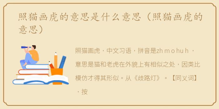 照猫画虎,中文习语,拼音是zh m o hu h ,意思是猫和老虎在外貌上有相似之处,因类比模仿才得其形似。从《歧路灯》。【同义词】,按瓢,按书。