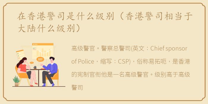 高级警官。警察总警司(英文:Chief sponsor of Police,缩写:CSP),俗称易拓呃,是香港的宪制官衔他是一名高级警官。级别高于高级警司,低于警务处助理处长,由警务处处长委任。