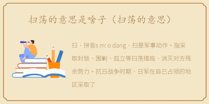 扫,拼音s m: o dang,扫是军事动作。指采取封锁、围剿、孤立等扫荡措施,消灭对方残余势力。抗日战争时期,日军在自己占领的地区采取了这种军事行动。日军扫荡最激烈的地区包括晋绥、晋冀鲁豫、晋察冀、山东三大边区,也是中国敌后战场最大的战略支点。