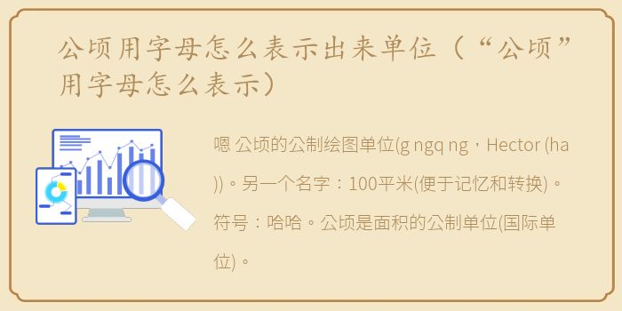 嗯.公顷的公制绘图单位(g ngq ng,Hector (ha))。另一个名字:100平米(便于记忆和转换)。符号:哈哈。公顷是面积的公制单位(国际单位)。一块面积为一公顷的土地,面积为一万平方米,比一个标准足球场略大。
