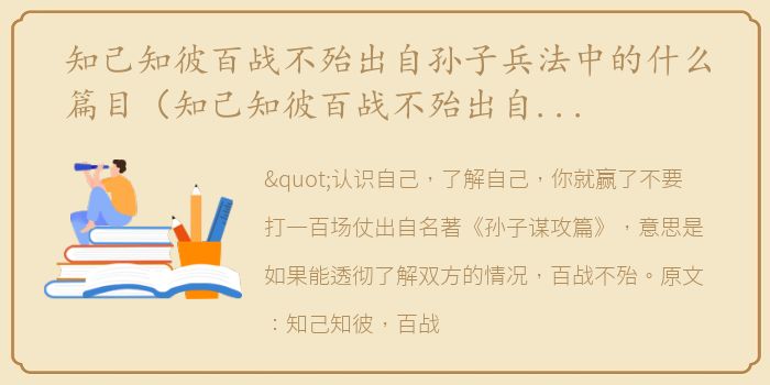 "认识自己,了解自己,你就赢了不要打一百场仗出自名著《孙子谋攻篇》,意思是如果能透彻了解双方的情况,百战不殆。原文:知己知彼,百战不殆不要打一百场仗;如果你不如果你不知道自己是谁,你就会有赢有输。如果你不我不知道你是谁,你将在每场战斗中处于危险之中。