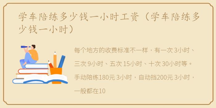 每个地方的收费标准不一样,有一次/3小时、三次/9小时、五次/15小时、十次/30小时等。手动陪练180元/3小时,自动挡200元/3小时,一般都在100元/小时的标准以上,不同车型价格也不同。