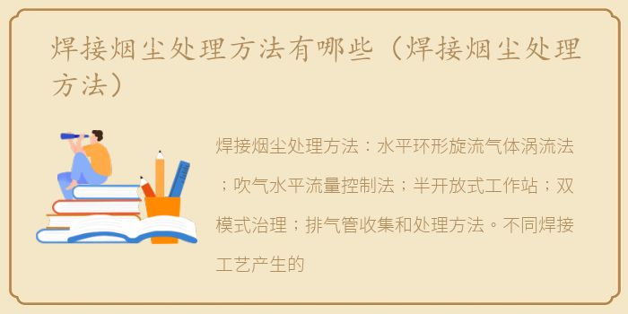 焊接烟尘处理方法:水平环形旋流气体涡流法;吹气水平流量控制法;半开放式工作站;双模式治理;排气管收集和处理方法。不同焊接工艺产生的焊接烟尘中有害物质和气体的种类、性质和数量有很大差异。