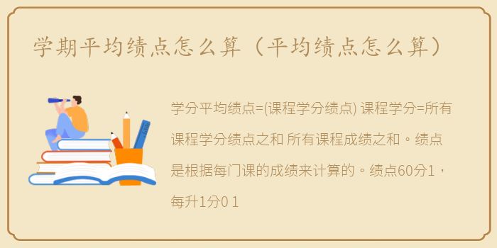 学分平均绩点=(课程学分绩点)/课程学分=所有课程学分绩点之和/所有课程成绩之和。绩点是根据每门课的成绩来计算的。绩点60分1,每升1分0.1,100分5。
