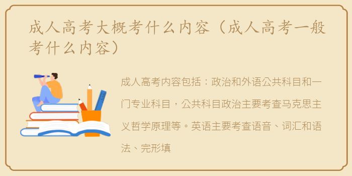 成人高考内容包括:政治和外语公共科目和一门专业科目,公共科目政治主要考查马克思主义哲学原理等。英语主要考查语音、词汇和语法、完形填空、阅读理解、完整对话和书面表达。