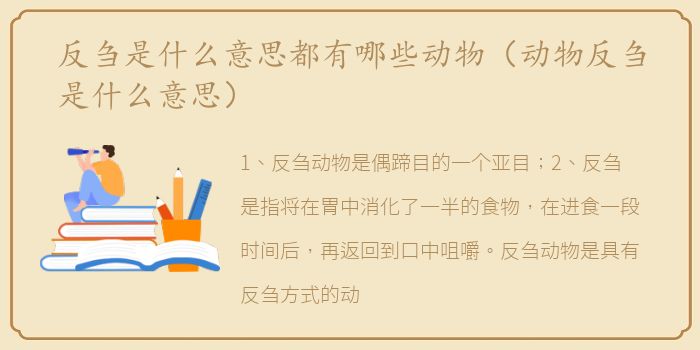 1、反刍动物是偶蹄目的一个亚目;2、反刍是指将在胃中消化了一半的食物,在进食一段时间后,再返回到口中咀嚼。反刍动物是具有反刍方式的动物。3、通常是一些食草动物,因为植物的纤维很难消化。