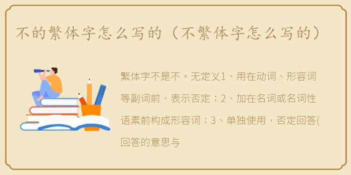 繁体字不是不。无定义1、用在动词、形容词等副词前,表示否定;2、加在名词或名词性语素前构成形容词;3、单独使用,否定回答(回答的意思与问题相反);4、用在句末表示疑问,和重复问句的作用一样。