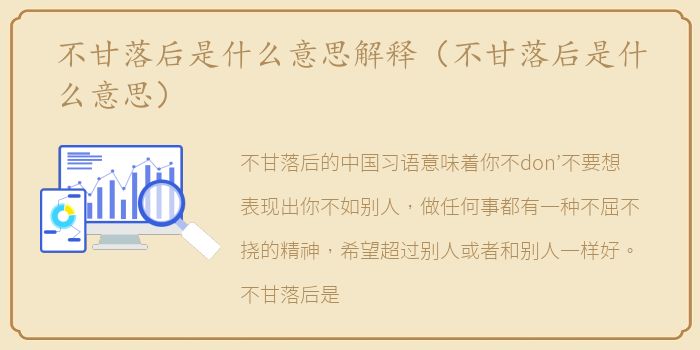不甘落后的中国习语意味着你不don’不要想表现出你不如别人,做任何事都有一种不屈不挠的精神,希望超过别人或者和别人一样好。不甘落后是形容一个人很上进。唐don’不要落在别人后面,要积极进取,要努力进步,不满足于现状,想要更大的发展空间。形容一个人积极心理学。
