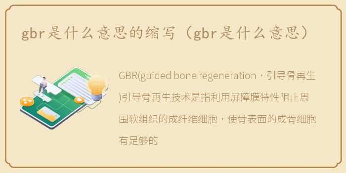 GBR(guided bone regeneration,引导骨再生)引导骨再生技术是指利用屏障膜特性阻止周围软组织的成纤维细胞,使骨表面的成骨细胞有足够的时间增殖,最终达到组织再生和靶向修复的目的。