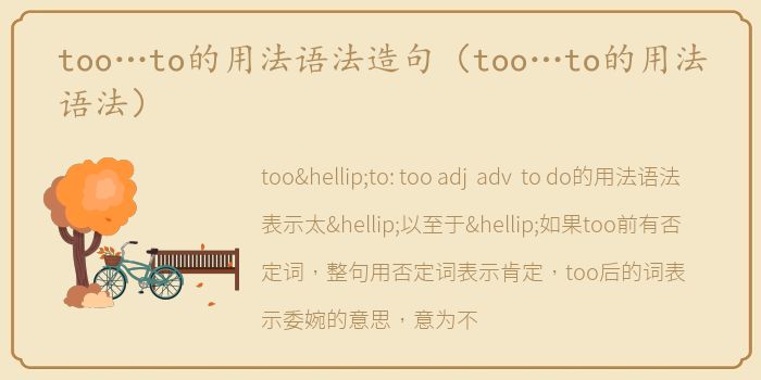 too…to: too adj./adv. to do的用法语法表示太…以至于…如果too前有否定词,整句用否定词表示肯定,too后的词表示委婉的意思,意为不完全是