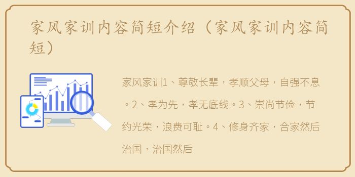 家风家训1、尊敬长辈,孝顺父母,自强不息。2、孝为先,孝无底线。3、崇尚节俭,节约光荣,浪费可耻。4、修身齐家,合家然后治国,治国然后天下太平。5、青少年不I don’我不知道如何努力学习,但老年人知道如何学习到很晚。6、唐不要作恶或变小,也不要。不要做好事或小事。7、亲贤者,远小人;讲究礼仪和诚信。