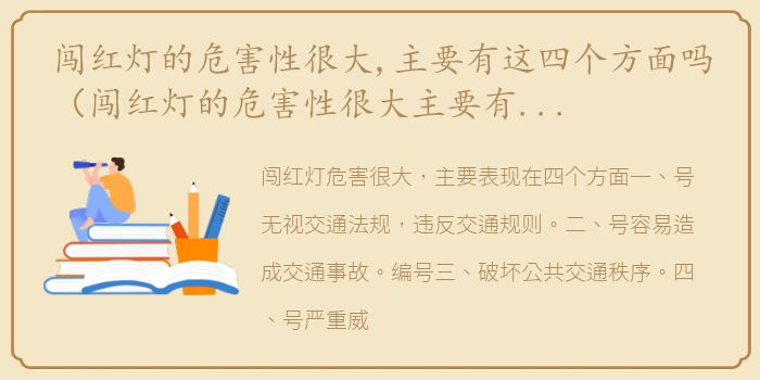 闯红灯危害很大,主要表现在四个方面一、号无视交通法规,违反交通规则。二、号容易造成交通事故。编号三、破坏公共交通秩序。四、号严重威胁自己和他人的生命财产安全。在违反交通法规的行为中,闯红灯是相当普遍的。这是对自己和他人安全的一种不尊重。机动车闯红灯的,扣6分,驾驶人执照被扣12分,需要进行满分教育,同时会处以一定的罚款。所以闯红灯对司机来说是得不偿失的。每天开车时,一定要避免闯红灯。以下是闯红灯的四大危害。