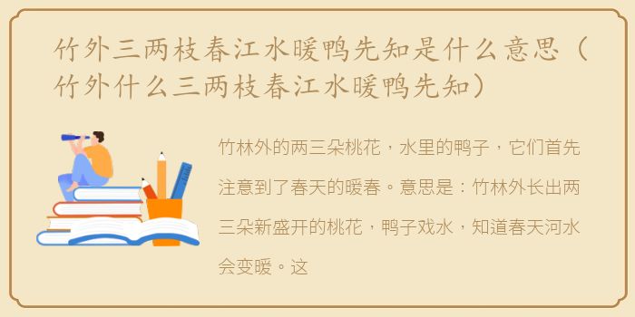 竹林外的两三朵桃花,水里的鸭子,它们首先注意到了春天的暖春。意思是:竹林外长出两三朵新盛开的桃花,鸭子戏水,知道春天河水会变暖。这首诗出自北宋苏轼《惠崇春江晚景》。全诗原文如下:竹外三两桃花,春江水暖鸭先知。沙滩上长满了艾草,芦笋也开始发芽,河豚正准备逆流而上,从大海游回河流。大雁北飞,像是想回到北方的人,却因为依恋,可怜的团队。在飞往北方之前,已经知道北方的沙漠里风雪交加,还是在南方度过大半个春节的南方。