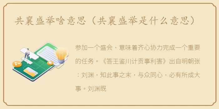 参加一个盛会,意味着齐心协力完成一个重要的任务。《答王鉴川计贡事利害》出自明朝张:刘渊,知此事之末,与众同心,必有所成大事。刘渊既然知道这件事的来龙去脉,又和你团结一致,就一定能成大事。例句:中国人民期待着澳门回归,祝愿祖国统一大业。期待亲人归来,愿阖家团圆,共享幸福。