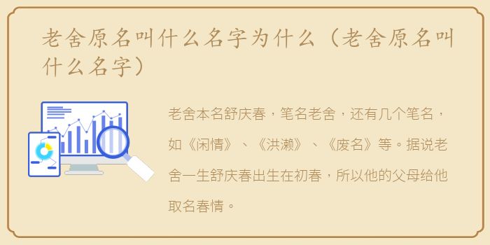 老舍本名舒庆春,笔名老舍,还有几个笔名,如《闲情》、《洪濑》、《废名》等。据说老舍一生舒庆春出生在初春,所以他的父母给他取名春情。老舍的单词是Sheyu,合起来就是一个舒词。