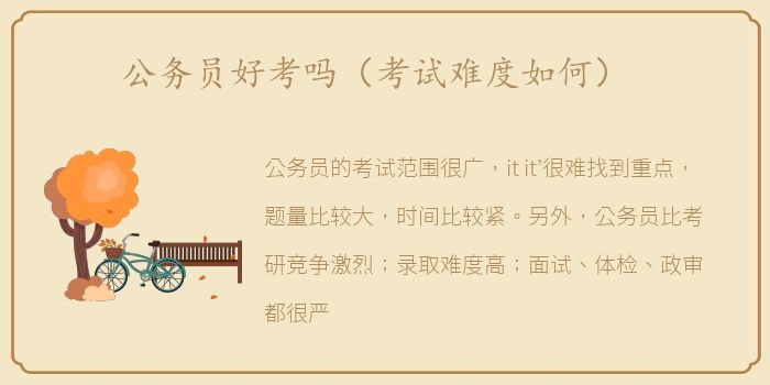 公务员的考试范围很广,it it’很难找到重点,题量比较大,时间比较紧。另外,公务员比考研竞争激烈;录取难度高;面试、体检、政审都很严格。如果决心考公务员,需要提前做好充分的准备。